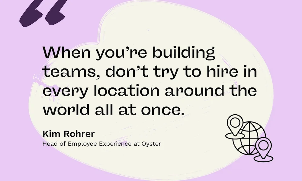 “When you’re building teams, don’t try to hire in every location around the world all at once,” advises Kim Rohrer, Oyster’s Head of Employee Experience. “Think about the employee experience and what it will be like to be the only person awake, or the only person working, in a certain region.”