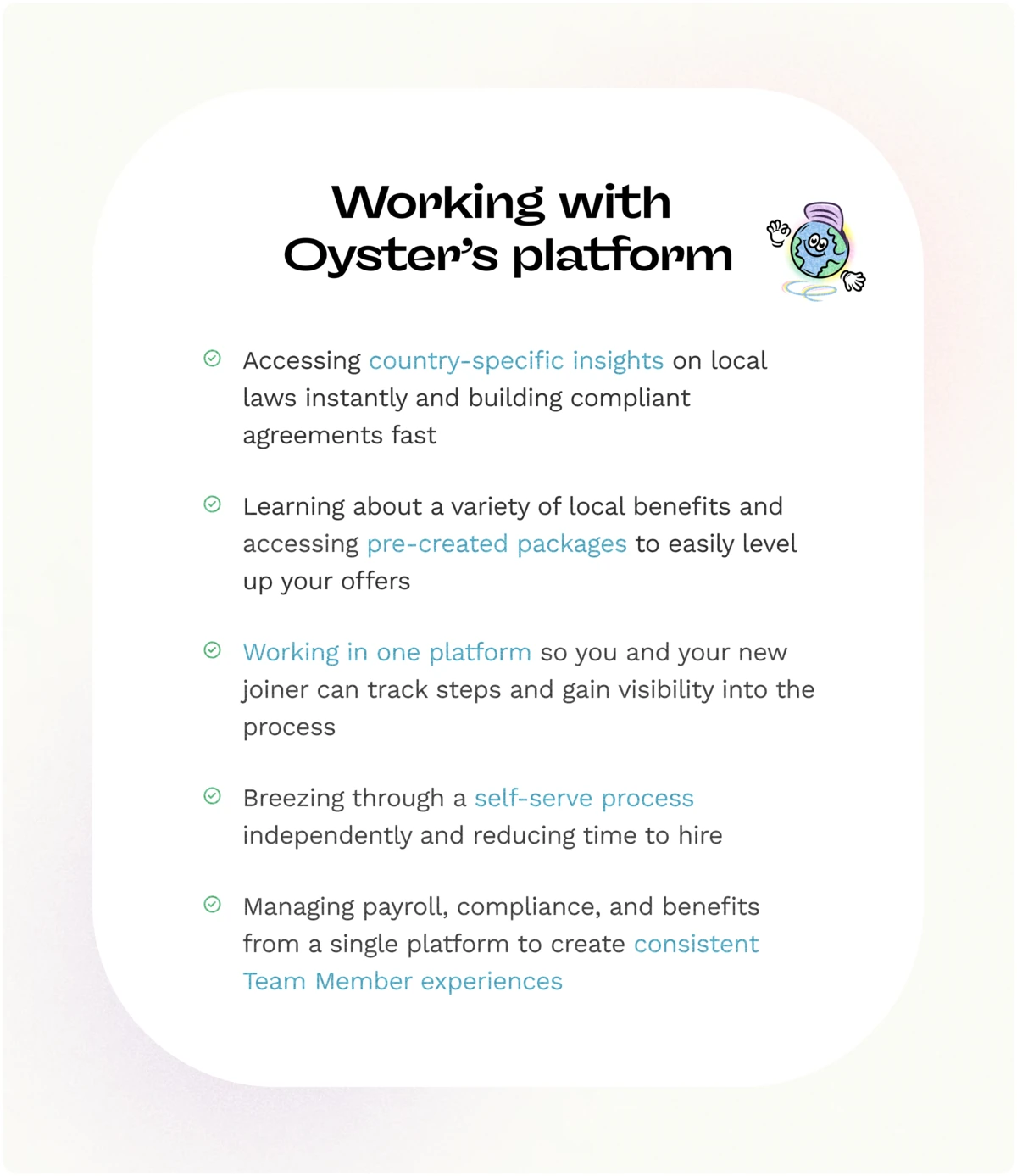 Global employment platforms like Oyster solve these compliance roadblocks by providing the infrastructure and partnership companies need to engage and retain global talent. What’s more, increased automation and a guided hiring process now make a once difficult task much easier.