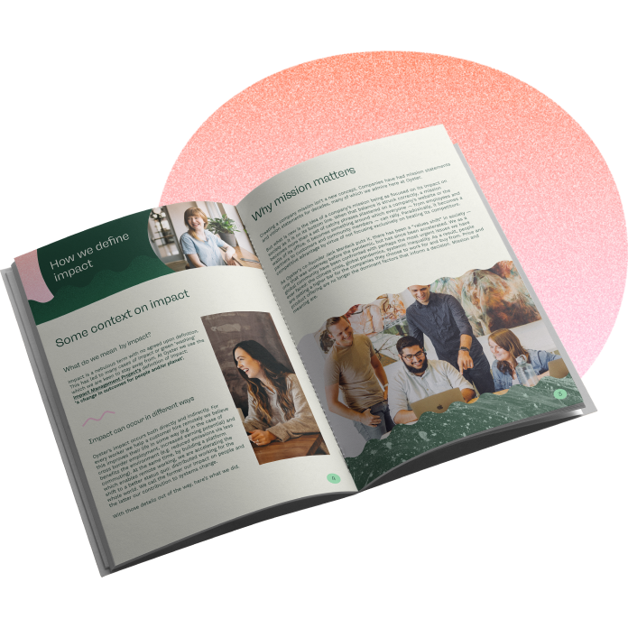 It has never been more important for companies to consider their impact on the world. Everyone from employees to customers to investors increasingly expect businesses to be agents for positive change. In this guide, you’ll find an easy-to-follow framework for transforming your company’s mission into measurable impact and get a behind-the-scenes look at how Oyster approached this process.